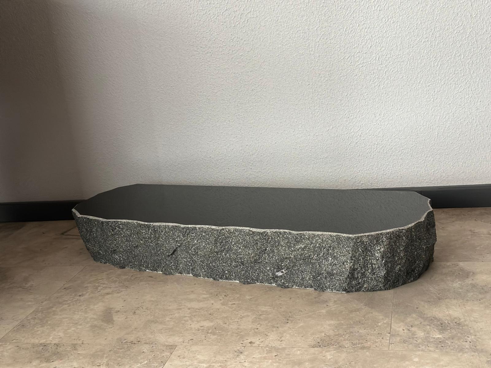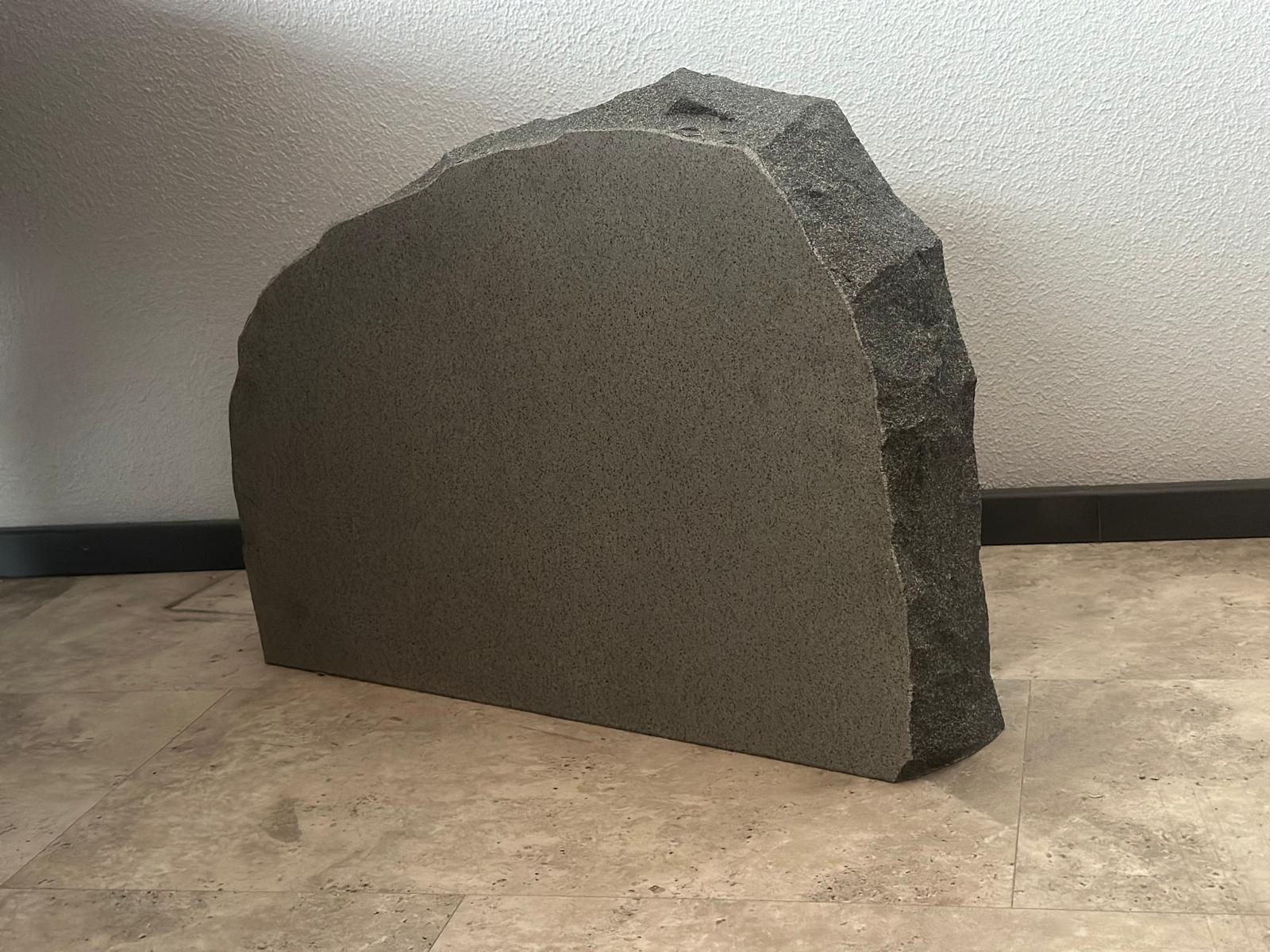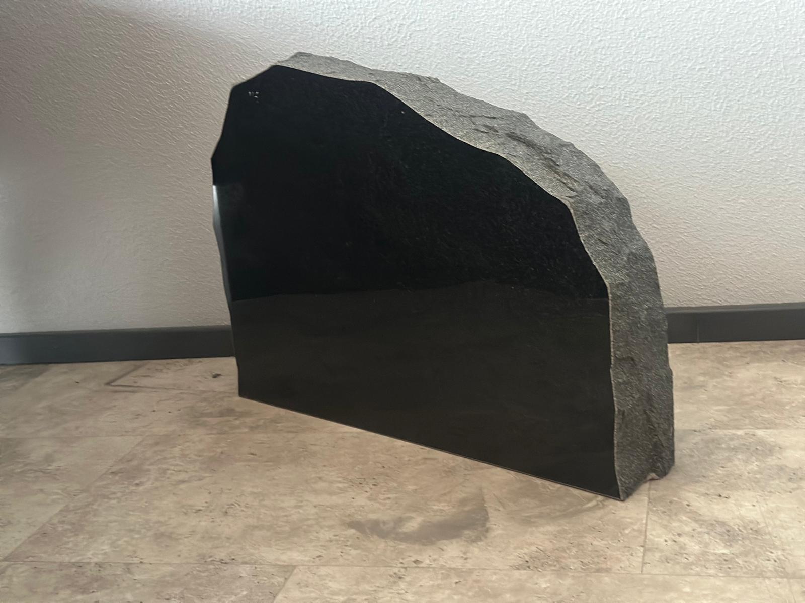 Hauakivi esikülg poleeritud, servad murtud helehallikat tooni, tagumine külg helehall sile sae pind.